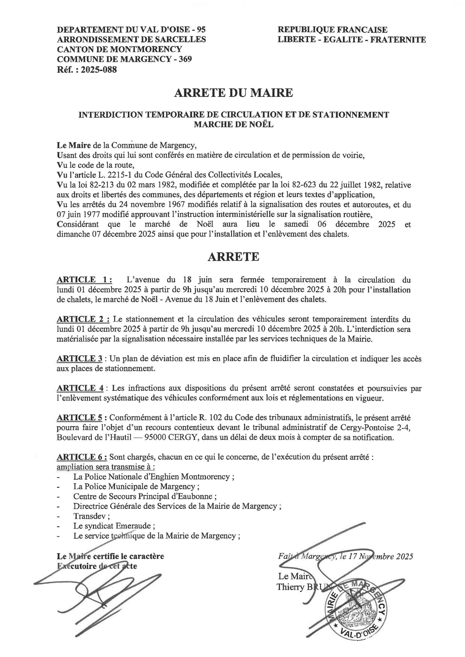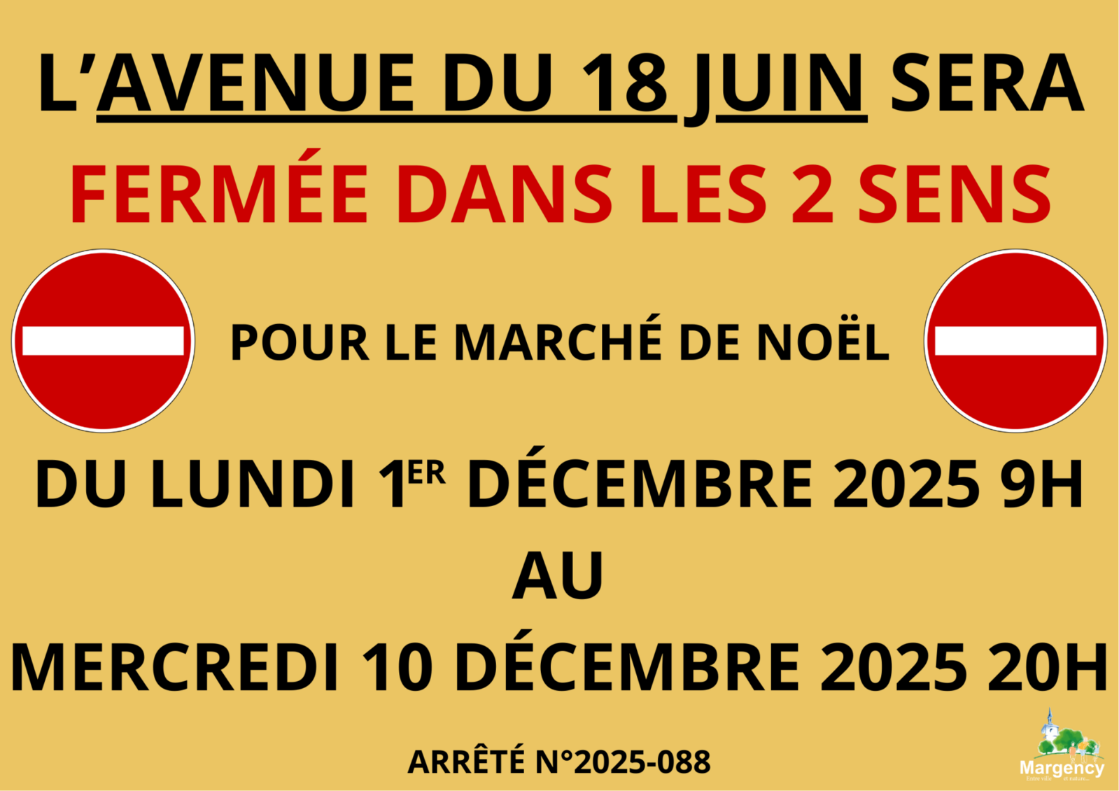 Fermeture exceptionnelle de l'avenue du 18 Juin Pour permettre le bon déroulement du Marché de Noël qui se tiendra les samedi 6 et dimanche 7 décembre, l’avenue du 18 Juin sera exceptionnellement fermée à la circulation : ➡️ du lundi 1er décembre à 9h Cette fermeture est nécessaire afin d’assurer votre sécurité pendant le montage et le démontage des chalets de Noël, ainsi que pour l’organisation de l’événement. La ville de Margency vous remercie pour votre compréhension et vous donne rendez-vous pour partager un moment chaleureux au Marché de Noël ! 🎄✨ |