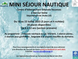 Les séjours à venir Les prochaines vacances s'annoncent mouvementées avec les séjours des Marcyens ! Pour avril, laissez vos enfants chevaucher et aller au galop avec un séjour de 3 jours au Poney-club des 4 saisons "Les Terrasses" à Mont St Sulpice. Du 27 au 29 avril prochain, 20 places disponibles pour les 4 à 6 ans. Avec l'arrivée de l'été, ce sera le retour des baignades en intérieur comme à l'extérieur avec le Centre d'hébergement Odyssée Vacances à Bar Sur Seine. Du 18 au 22 juillet 2022, 20 places disponibles pour les 6 à 12 ans. Pour tous renseignements et inscriptions, contactez directement la direction de l'accueil du centre, lesmarcyens@orange.fr Vous pouvez également visiter https://www.mairie-margency.fr/centre-de-loisirs-les-marcyens-mairie-margency-95-valdoise_fr.html pour plus de renseignements. |