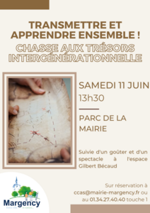 Une chasse dans le parc de la mairie Le CCAS et les jeunes en service civique d'UNIS Cité organisent une grande chasse aux trésors dans le parc de la Mairie de Margency. Autour du thème « transmettre et apprendre », cet évènement a pour objectif de réunir séniors et juniors qui par petit groupe devront mettre en commun leurs connaissances afin de répondre à des questions sur l'histoire, le patrimoine culturel et naturel de Margency. 36 énigmes sont prêtes à être résolues par 90 participants ! Cette chasse se terminera par un goûter puis un spectacle chanté à l'espace Gilbert Bécaud. Réservez dès à présent le samedi 11 juin ! Pour vous inscrire, il vous suffit d'envoyer un mail à ccas@mairie-margency.fr ou de contacter directement le 01.4.27.40.40 touche 1. |