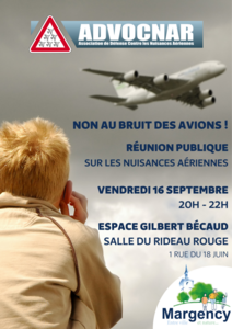 Contre les nuisances sonores des avions Advocnar, l'association de Défense contre les Nuisances Aériennes organise une réunion publique à Margency le vendredi 16 septembre de 20h à 22h à la salle du Rideau Rouge de l'espace Gilbert Bécaud de Margency. Vous êtes invités à y participer afin de discuter autour des solutions qui existent face aux nuisances aériennes. |