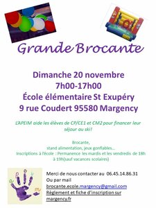 Les permanences sont ouvertes L'APEIM aide les enfants de CP/CE1 et CM2 de l'école élémentaire à organiser leur séjour au ski ! Pour ce faire, une grande brocante est organisée le dimanche 20 novembre de 7h00 à 17h00 à l'école élémentaire St Exupéry. Si vous souhaitez y tenir votre propre stand, il suffit de vous inscrire lors d'une permanence de l'association, les mardis et vendredis de 18h00 à 19h00 hors vacances scolaires. |
