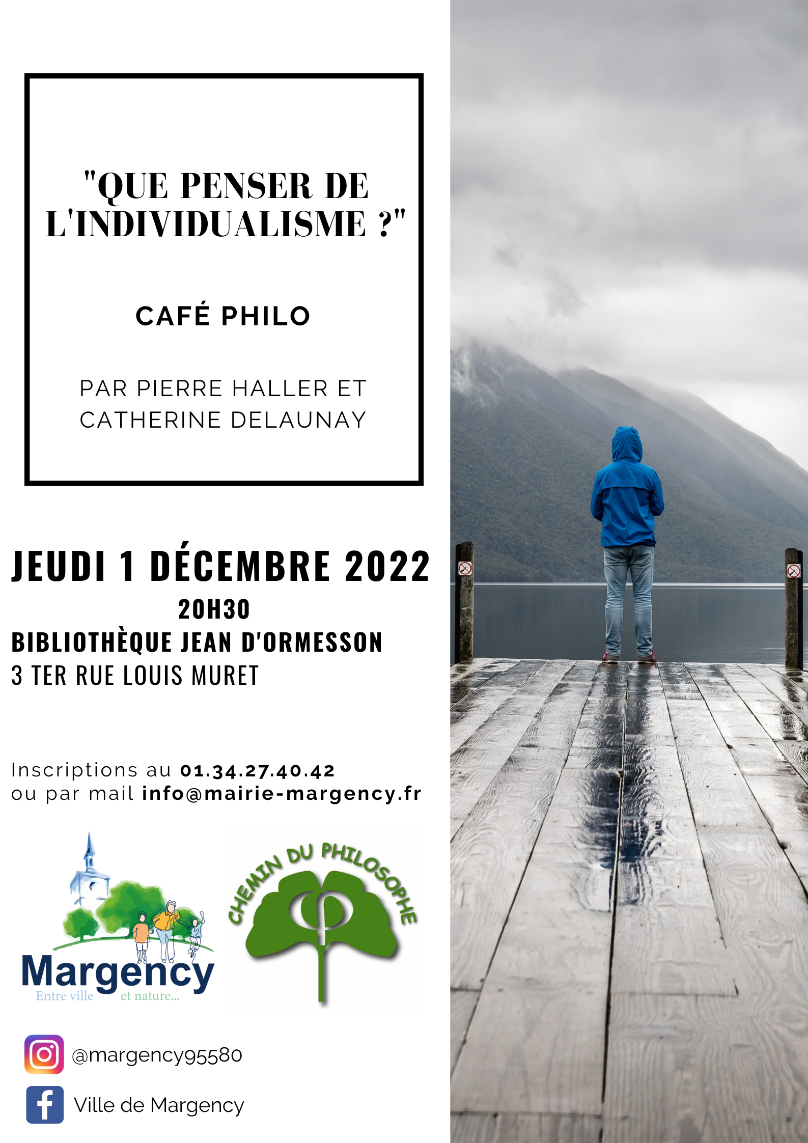 L'individualisme "Que penser de l'individualisme ?" sera le prochain thème du café philo de Margency. Assistez et échangez autour de ce sujet avec Catherine DELAUNAY et Pierre HALLER le jeudi 1 décembre à 20h30 à la bibliothèque Jean d'Ormesson (3ter rue Louis Muret). Pour vous inscrire, contactez le 01.34.27.40.42 ou envoyer un mail à info@mairie-margency.fr en précisant les noms et prénoms des participants. |