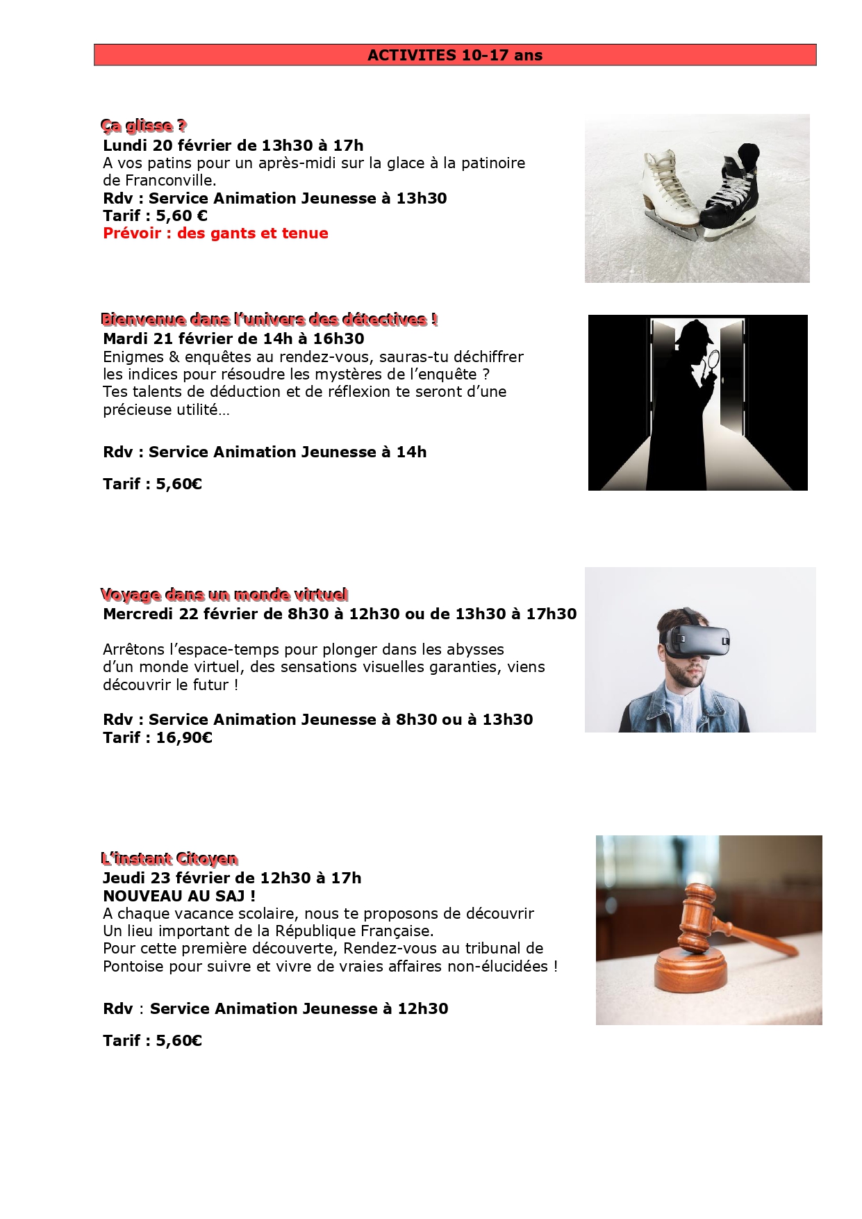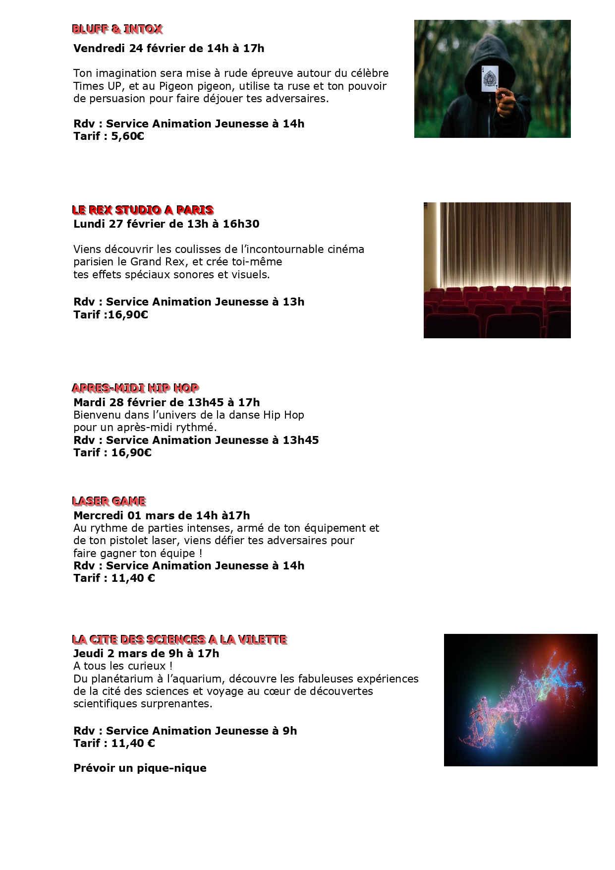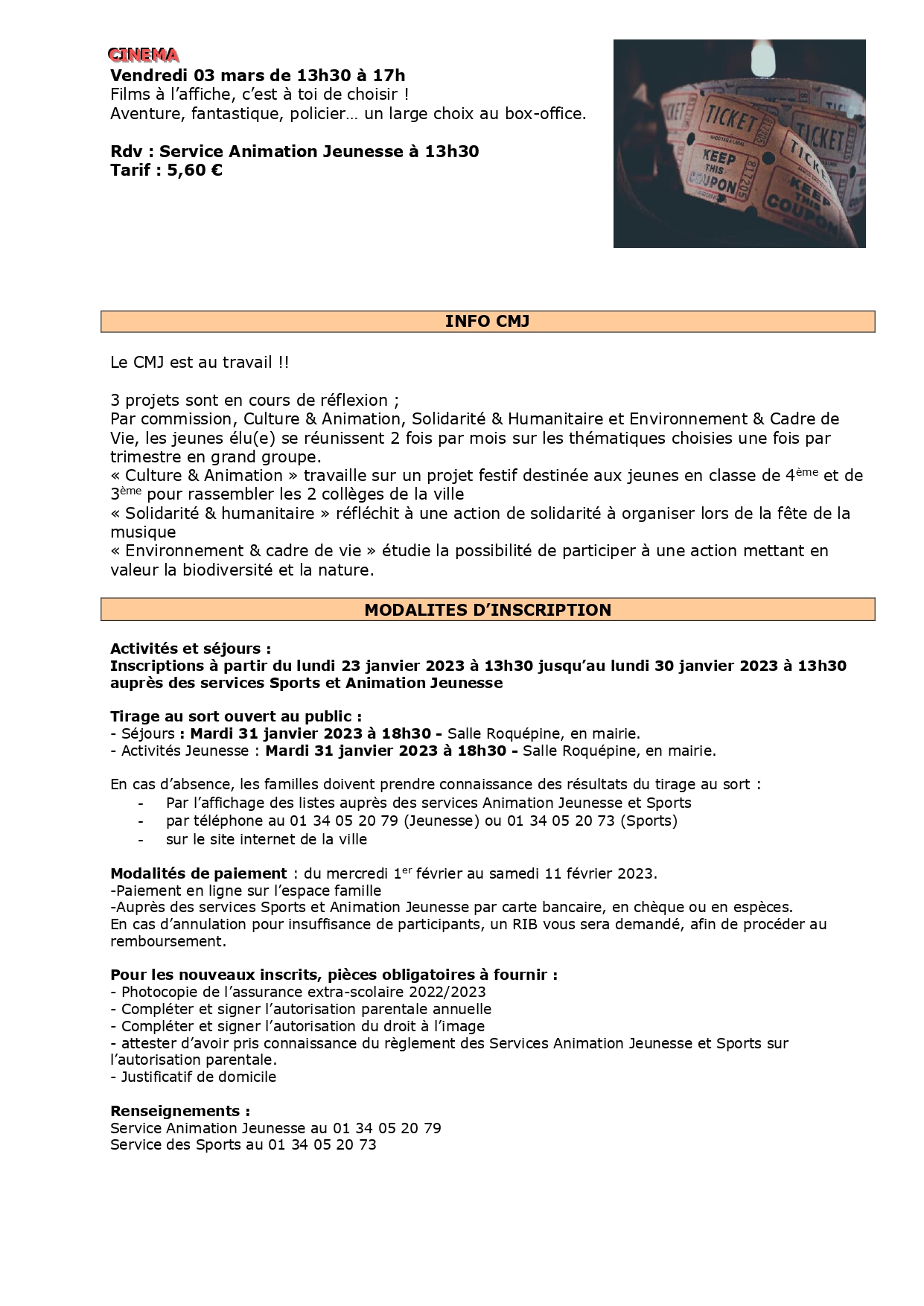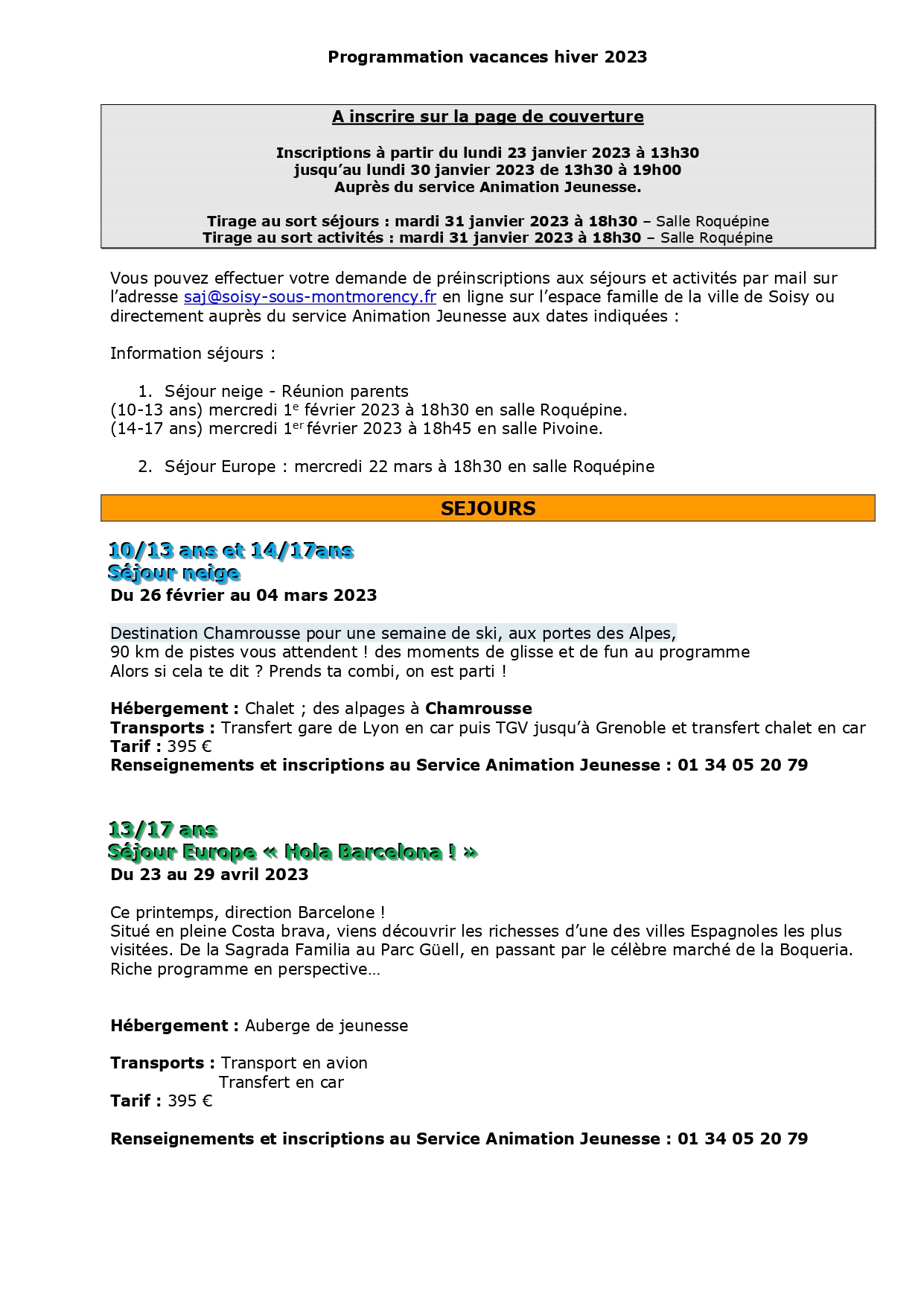 Le programme est là ! Le programme de séjour de Soisy-sous-Montmorency est de retour ! N'attendez plus et inscrivez-vous aux vacances d'hiver 2023 du Service Animation Jeunesse de Soisy-sous-Montmorency ! Du 26 février au 04 mars, partez à la découverte de Chamrousse pour une semaine de ski et de fun. Du 23 au 29 avril, direction Barcelone pour découvrir les richesses de l’une des villes espagnoles les plus visitées. Vous aurez aussi l'occasion de participer à des activités variées et passionnantes : patinage, énigmes et enquêtes, voyage dans un monde virtuel, visite du tribunal de Pontoise, jeux de société, danse hip hop, laser game, visite de la Cité des Sciences et cinéma. Inscrivez-vous à partir du lundi 23 janvier à 13h30 jusqu’au lundi 30 janvier de 13h30 à 19h00 auprès du Service Animation Jeunesse. Tirage au sort séjours : mardi 31 janvier à 18h30 - Salle Roquépine et tirage au sort activités : mardi 31 janvier à 18h30 - Salle Roquépine. Pour plus d'informations, contactez les services Animation Jeunesse au 01 34 05 20 79 et Sports au 01 34 05 20 73. |
