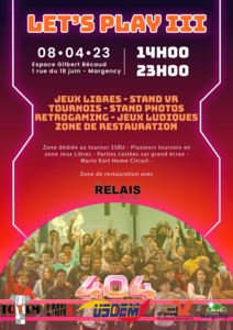Let's Play C'est le grand retour de Let's Play III ! Rendez-vous le samedi 08 avril 2023 à l'espace Gilbert Bécaud de 14h00 à 23h00 à Margency pour un événement de gaming unique en son genre ! Des jeux libres, un stand VR, des tournois, un stand photos, du rétrogaming, des jeux ludiques ainsi qu’une zone de restauration proposée par Le Relais du Lac. Alors n'attendez plus et venez vivre l'expérience Let's Play III ! |