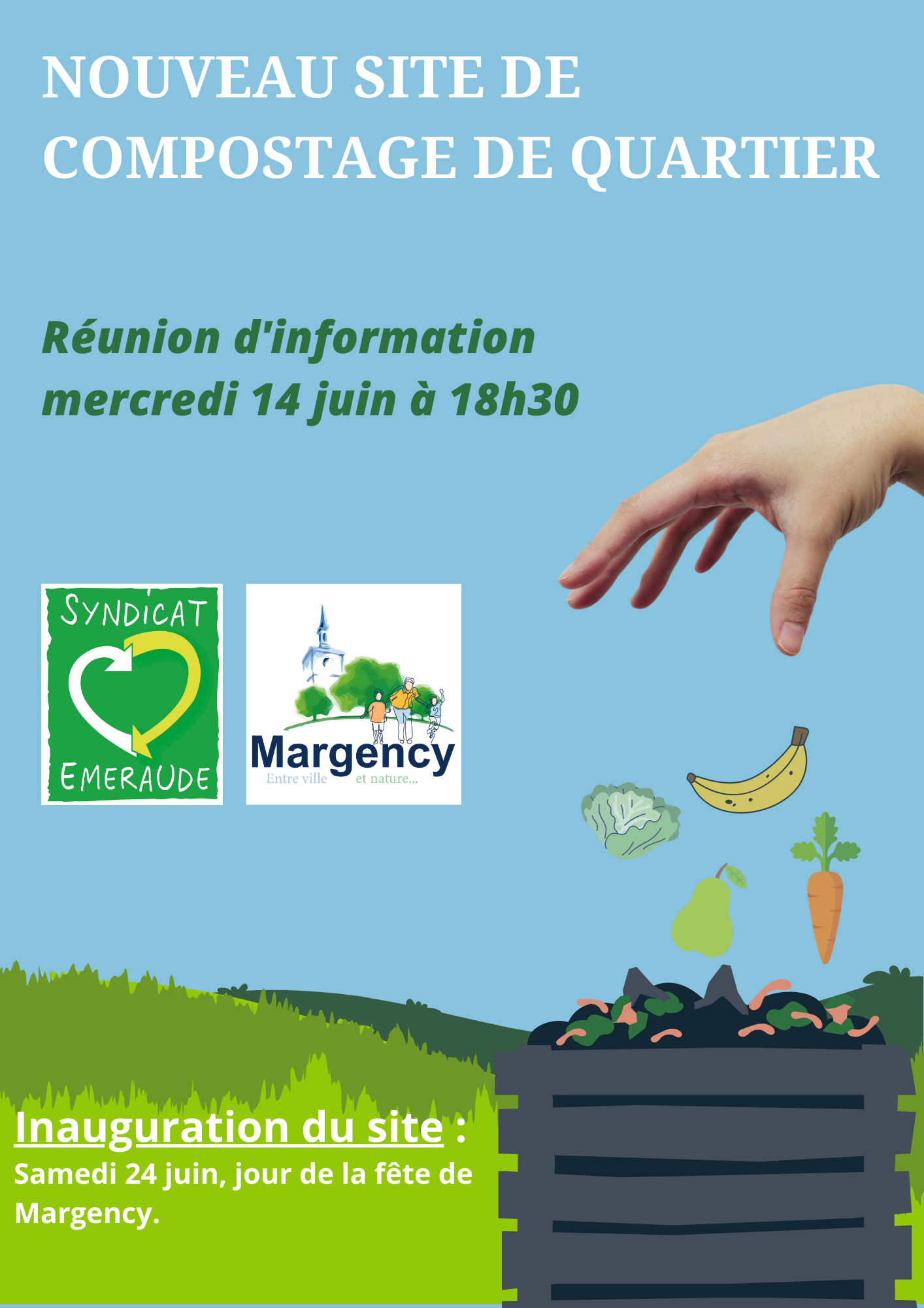 Un nouveau composteur à Margency Nous sommes ravis d'annoncer l'ouverture d'un nouveau site de compostage de quartier dans le parc de la Mairie. En partenariat avec le Syndicat Emeraude, la Municipalité souhaite permettre à tous les Margencéens de valoriser leurs déchets organiques. Ce composteur de quartier répondra à la réglementation du tri à la source des biodéchets dès le 31 décembre 2023. Une réunion d'information aura lieu le jeudi 14 juin à 18h30 à la mairie de Margency. L'inauguration du site se fera le 24 juin, jour du festival « Couleurs Caraïbes », avec des ateliers de formation et la distribution de bioseaux. |
