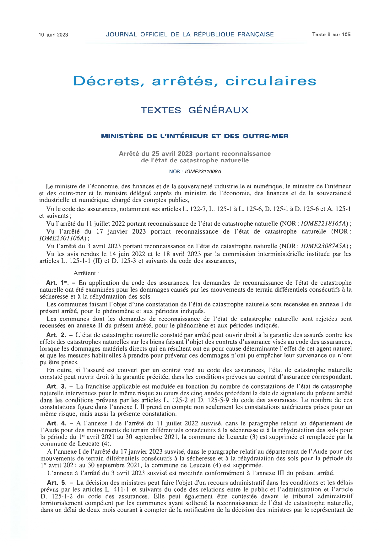 Reconnaissance de l'état de catastrophe naturelle Notre ville a été reconnue en état de catastrophe naturelle en raison des mouvements de terrain causés par la sécheresse et la réhydratation des sols entre le 1er avril et le 30 juin 2022. Veuillez noter que vous disposez d'un délai de 30 jours, jusqu'au 9 juillet 2023 à minuit, pour entreprendre les démarches nécessaires. |