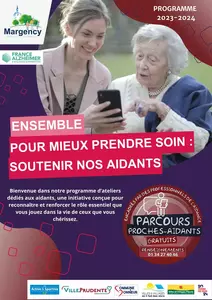 Ateliers aidants Afin de vous aider à prendre soin de vos proches, la ville de Margency s'engage aux côtés de l'association "France Alzheimer" et vous propose toute une série d'ateliers durant la saison 2023-2024. Ces ateliers sont encadrés par des professionnels de l'aidance. Demandez le détail des ateliers ainsi que les modalités d'inscriptions au 01 34 27 40 46. |