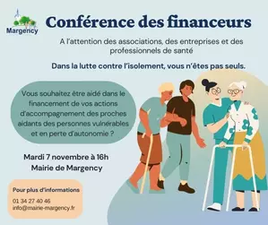 Conférence des financeurs Vous êtes une association, une entreprise ou un(e) professionnel(le) de santé ? Vous souhaitez être aidé dans le financement de vos actions d'accompagnement des proches aidants des personnes vulnérables et en perte d'autonomie ? Venez à la conférence des financeurs mardi 7 novembre à 16h à la mairie de Margency. Pour plus d'informations appelez le 01 34 27 40 46 ou envoyez un mail au info@mairie-margency.fr |