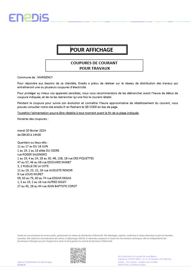 Coupures de courant Pour répondre aux besoins de sa clientèle, Enedis a prévu de réaliser sur le réseau de distribution des travaux qui entraîneront une ou plusieurs coupures d’électricité. Pour protéger au mieux vos appareils sensibles, nous vous recommandons de les débrancher avant l'heure de début de coupure indiquée, et de ne les rebrancher qu’une fois le courant rétabli. Pendant la coupure pour suivre son évolution et connaître l’heure approximative de rétablissement du courant, vous pouvez consulter notre site enedis.fr en flashant le QR CODE en bas de page. Toutefois l’alimentation pourra être rétablie à tout moment avant la fin de la plage indiquée. Horaires des coupures : mardi 20 février 2024 de 08h00 à 15h30 Quartiers ou lieux-dits : 11 au 17 av DU 18 JUIN 1 au 19, 2 au 18 allée DU CEDRE rue ROGER SALENGRO 1 au 19, 4 au 24, 28 au 30, 4B, 13B, 1B rue DES PIQUETTES 47 au 57, 46 au 58 rue EDOUARD MANET 3, 2 RUELLE DE LA COTE 11 au 19, 23, 22, 26 rue AUGUSTE RENOIR 9 rue LOUIS MURET 59, 63 au 75, 60 au 74 rue EDGAR DEGAS 1, 5 au 19, 2 au 18 rue ALFRED SISLEY 27 au 45, 28 au 44 rue JEAN BAPTISTE COROT |