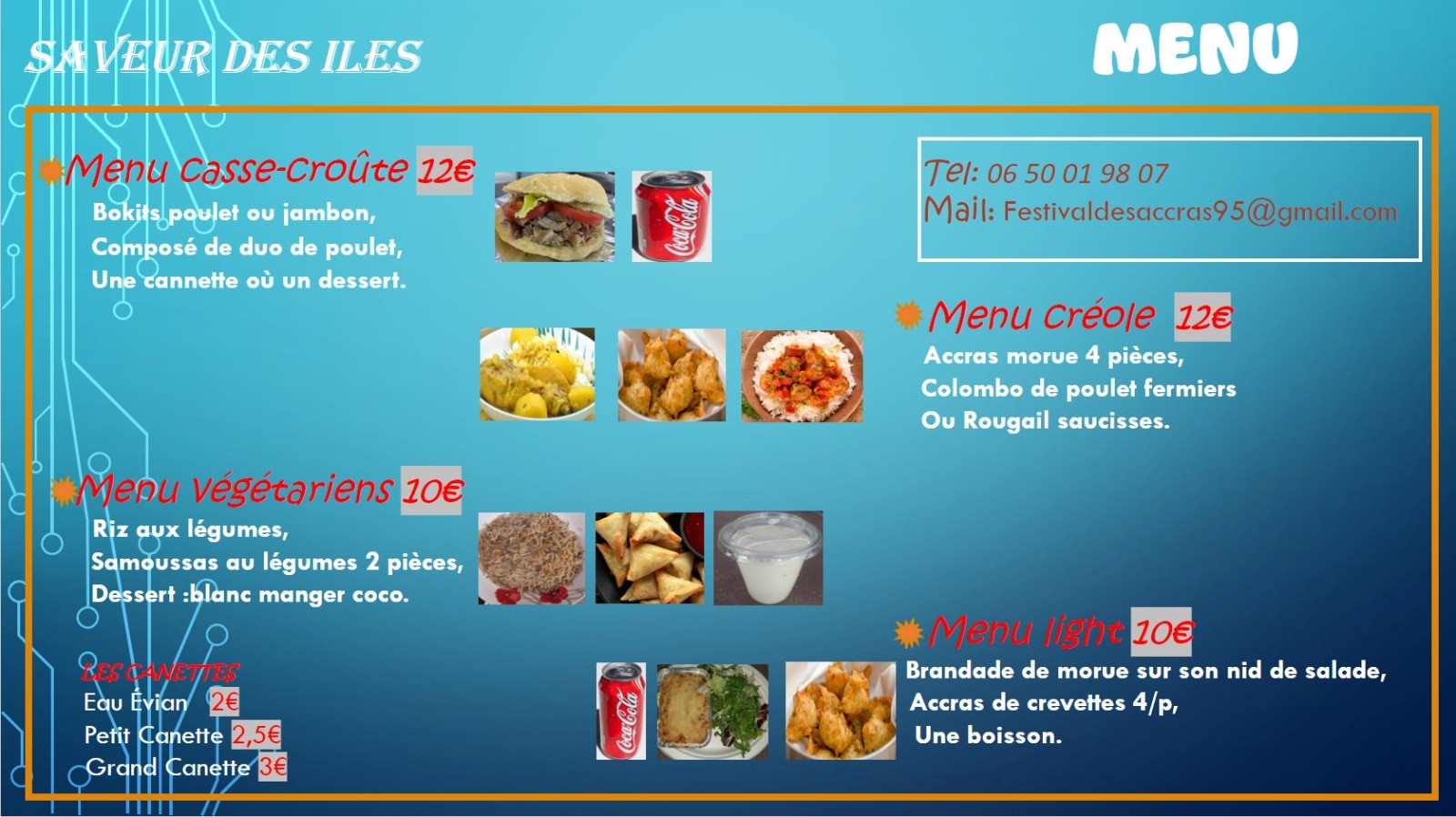 Food truck antillais à Margency Un nouveau food truck s'installe à Margency ! Dès le vendredi 05 avril à partir de 18h et tous les vendredis qui suivent, vous trouverez devant la mairie de quoi enchanter vos papilles avec des spécialités antillaises ! Accras, rougail saucisses, brandade de morue, colombo de poulet ou encore samoussas... Venez découvrir les nombreuses saveurs des îles que propose "Festival des Accras" ! |
