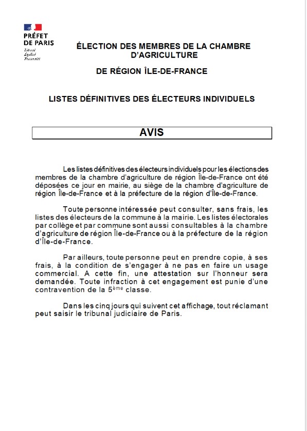 Elections des membres de la chambre d’agriculture de Région Ile de France Dans le cadre des élections des membres de la chambre d’agriculture de Région Ile de France les listes définitives des électeurs individuels pour les élections des membres de la chambre d’agriculture de région Île-de-France ont été déposées ce jour en mairie, au siège de la chambre d’agriculture de région Île-de-France et à la préfecture de la région d’Île-de-France. |