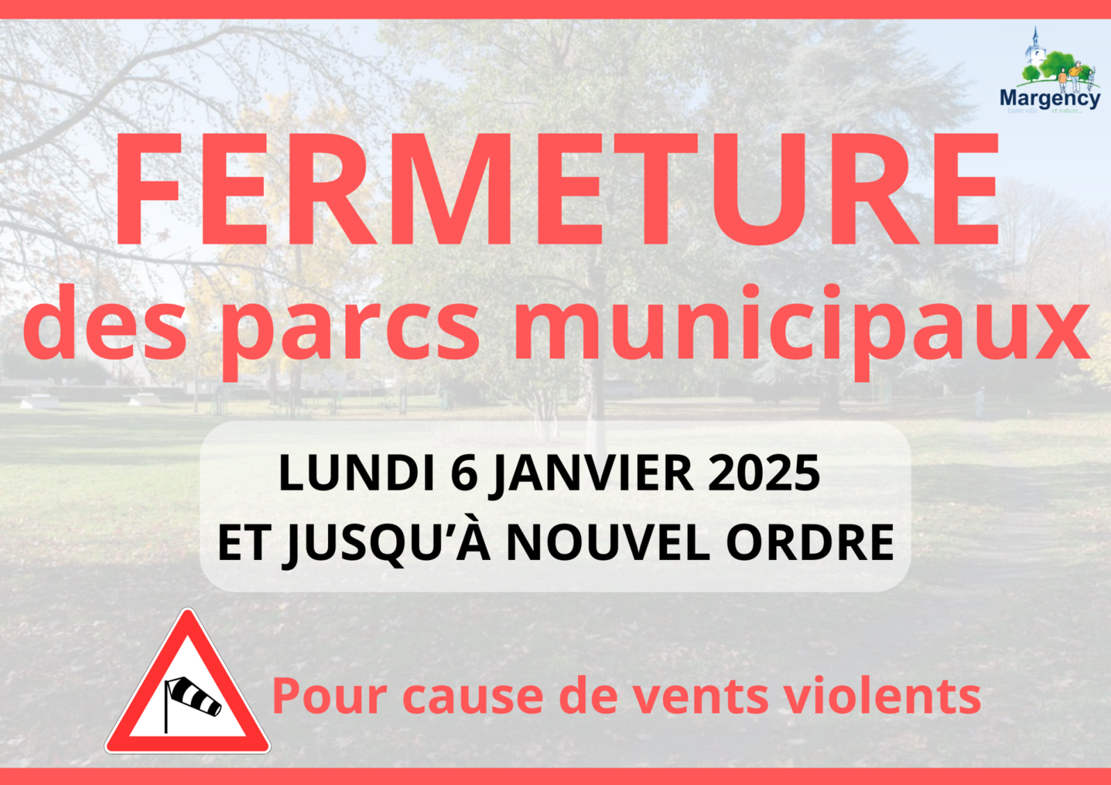 Afin de garantir la sécurité de tous durant l'alerte vents violents, la ville de Margency ferme exceptionnellement ses parcs municipaux ce lundi 6 janvier 2025 à partir de 11h et ce jusqu'à nouvel ordre. Pour plus d'informations, merci de contacter la mairie au 01 34 27 40 40 ou par mail à info@mairie-margency.fr Soyez vigilant. |