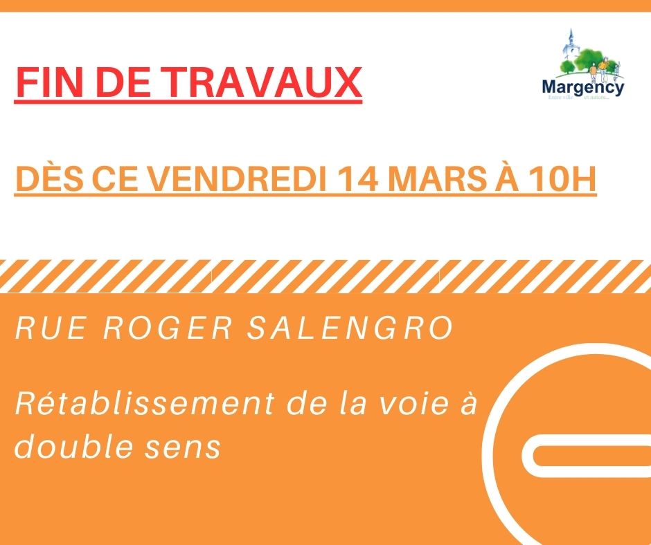 Fin de travaux Dès ce vendredi 14 mars à 10h, les travaux de la rue Salengro prendront fin et la voie à double sens sera rétablie. |
