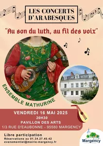 Concert d'Arabesques Le prochain Concert d'Arabesques approche à grands pas ! Nous avons le plaisir de vous convier à une soirée musicale exceptionnelle qui se tiendra le vendredi 16 mai à 20h30, dans le cadre enchanteur du Pavillon des Arts. Lors de cet événement unique, laissez-vous emporter par l’élégance du programme "Au son du Luth, au fil des voix", une rencontre envoûtante entre instruments anciens et voix subtiles. Vous aurez l’occasion d’y découvrir ou redécouvrir trois artistes de talent : Constance Grard, Sarah Verrees et Nicolas Arzimanoglou Mas, qui uniront leur sensibilité et leur virtuosité pour vous offrir un moment suspendu, entre raffinement musical et émotion pure. Libre participation. Renseignements et réservations au 01 34 27 40 42 ou par mail à evenementiel@mairie-margency.fr |