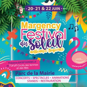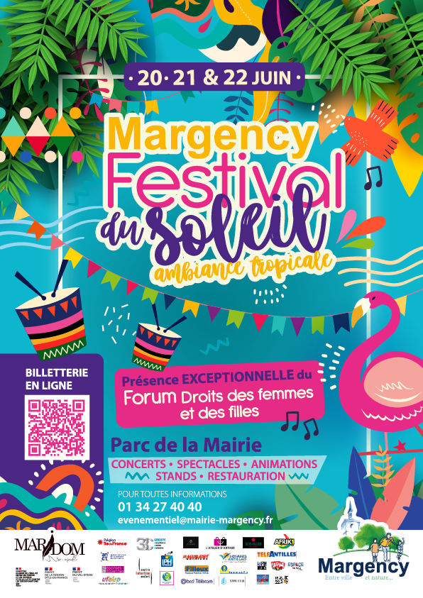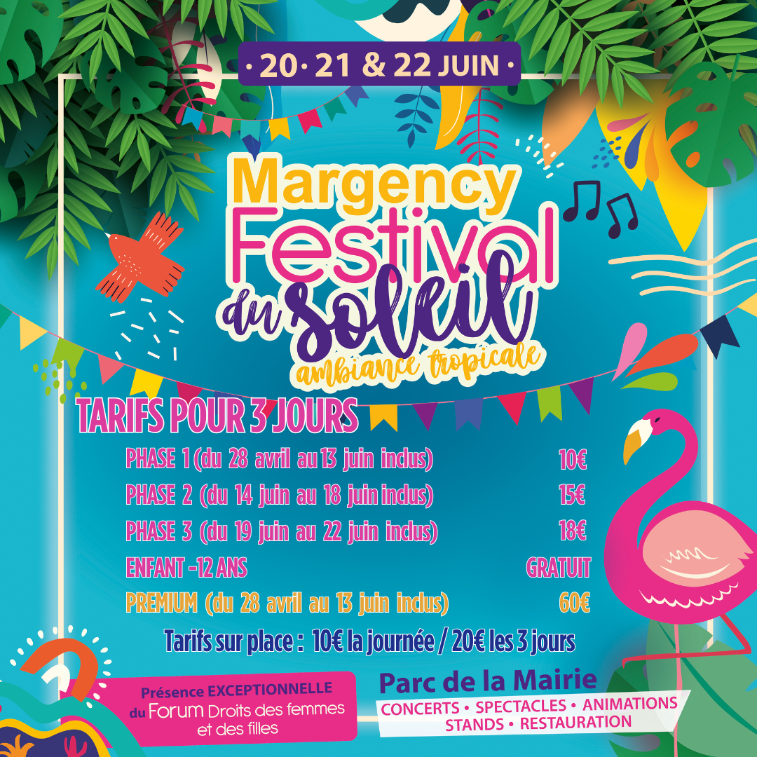 Festival du Soleil 2025 LE FESTIVAL DU SOLEIL FAIT SON GRAND RETOUR ! Pour la 3e année consécutive, le Festival du Soleil revient les 20, 21 et 22 juin 2025 pour 3 jours de fête, de musique, de saveurs et de partage dans une ambiance 100% tropicale ! NOUVEAUTÉ 2025 : un Forum des Droits des Femmes et des Filles, avec conférences, débats, associations et animations engagées. AU PROGRAMME : Vendredi 20 juin : Soirée spéciale Années 80 – Sortez les paillettes et les vinyles ! Samedi 21 juin : Ambiance Tropicale – Cap sur les Antilles, l’Amérique Latine, les Caraïbes ! Dimanche 22 juin : Soirée Corse – Chants, saveurs et traditions insulaires à l’honneur Côté food : antillaise, méditerranéenne, grecque, corse, latine… un véritable voyage culinaire sous le signe du soleil. Artisanat local : découvrez les stands de créateurs et producteurs passionnés. Pour toute la famille : Garderie, activités pour les jeunes, ferme pédagogique, balades en poney, jeux et animations toute la journée ! Spectacles & concerts non-stop, dès l'ouverture jusqu’à la nuit. Dates : 20, 21 et 22 juin 2025 Lieu : Parc de la Mairie - 5 av. Georges Pompidou, Ville de Margency Renseignements : 01 34 27 40 40 ou evenementiel@mairie-margency.fr ATTENTION : le festival est payant cette année ! Profitez vite de la phase 1 à 10 € pour les 3 jours et gratuit pour les -12 ans. Vous êtes Margencéens ? Contactez la mairie AVANT LE 13 JUIN à evenementiel@mairie-margency.fr ou au 01 34 27 40 74 pour recevoir jusqu'à 2 billets nominatifs et non cessibles par foyer (sous conditions). Réservez vos places ici : BILLETTERIE |