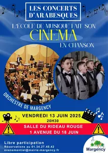 Les Concerts d'Arabesques Changement de lieu pour le concert d'Arabesque du 13 juin ! En raison des orages prévus, nous vous informons que le concert d'Arabesque "L'école de musique fait son cinéma en chanson" du vendredi 13 juin à 20h30 se déroulera finalement à la Salle du Rideau Rouge plutôt que sur la terrasse du Pavillon des Arts. Libre Participation. Renseignements et réservations au 01 34 27 40 42 ou par mail à evenementiel@mairie-margency.fr |