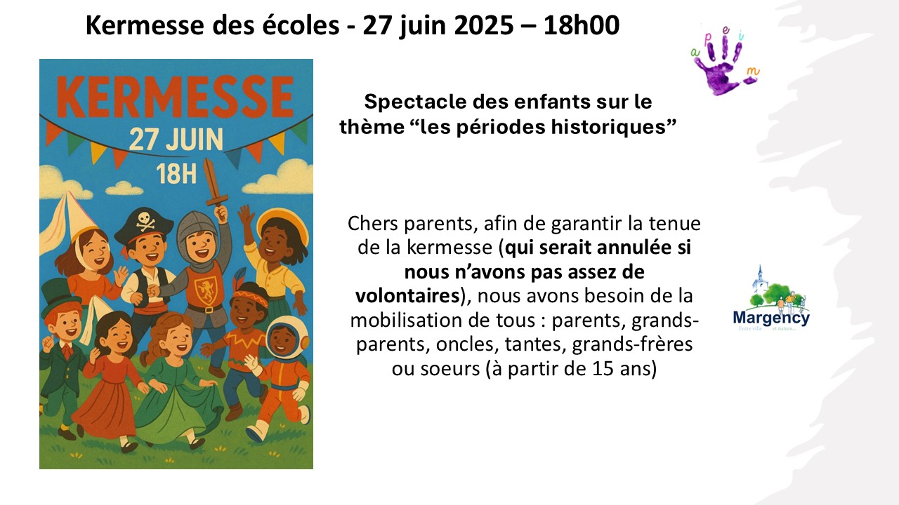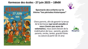 Kermesse des écoles Le vendredi 27 juin à 18h, retrouvez la kermesse des écoles organisée par l'APEIM. Cette année, le thème du spectacle des enfants est "les périodes historiques". Chers parents, afin de garantif la tenue de la kermesse (qui serait annulée si l'APEIM n'a pas assez de volontaires), l'association a besoin de la mobilisation de tous : parents, grands-parents, oncles, tantes, grands frères et grandes soeurs (à partir de 15 ans). Merci de contacter l'APEIM pour plus d'informations. |