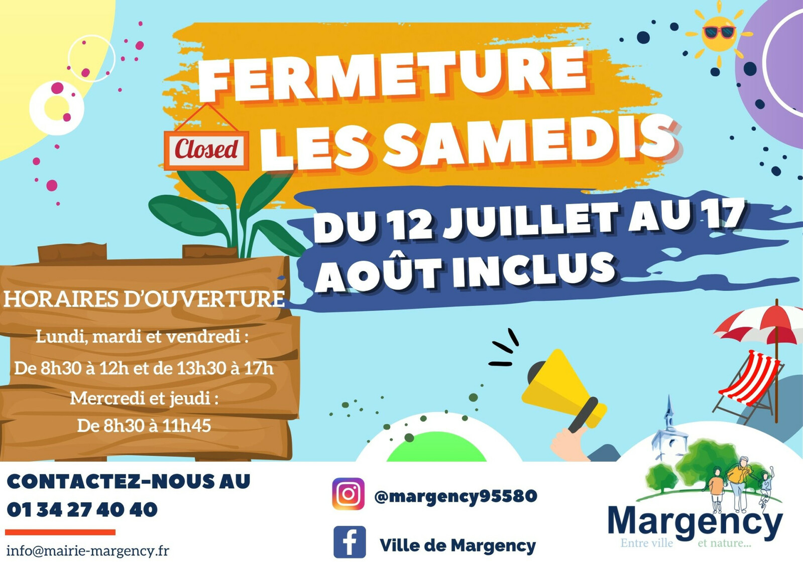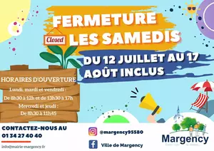 Fermeture estivale de la mairie les samedis Nous vous informons que la mairie sera fermée tous les samedis du 12 juillet au 17 août inclus.