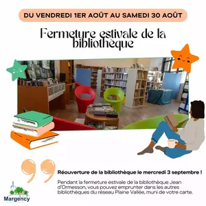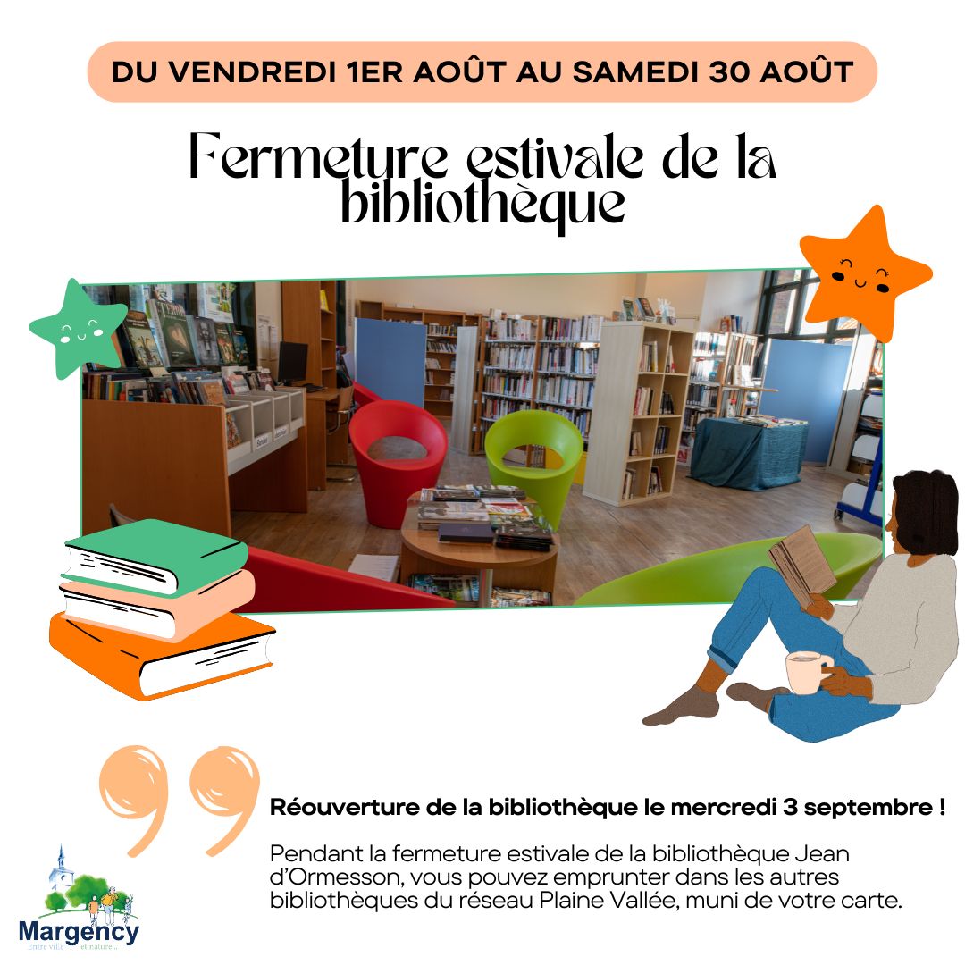 Fermeture estivale de la bibliothèque Jean d’Ormesson Nous vous informons que la bibliothèque Jean d’Ormesson sera fermée du vendredi 1er août au samedi 30 août pour la période estivale. La réouverture de la bibliothèque se fera le mercredi 3 septembre aux horaires habituels. Pendant cette fermeture, vous pouvez continuer à emprunter des livres dans les autres bibliothèques du réseau Plaine Vallée. Assurez-vous simplement d'avoir votre carte de bibliothèque avec vous. Vous pouvez rendre vos documents empruntés à la bibliothèque de Margency dans les autres bibliothèques du réseau ou les rendre en septembre. Vos prêts actuels sont valables jusqu'au 9 septembre. Nous vous remercions pour votre compréhension et vous souhaitons un bel été ! |