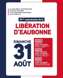 Cérémonie - 81e anniversaire de la libération d'Eaubonne Vous êtes invités à la cérémonie du 81e anniversaire de la libération d'Eaubonne ce dimanche 31 août à 10h30 au rond-point Kichkine de Margency. Joignez-vous à nous aux côtés de Monsieur le Maire, Thierry Brun, pour honorer ensemble la mémoire de celles et ceux qui ont œuvré pour la liberté. |