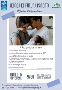 Réunion d'informations La CAF et la mairie de Margency invitent les futurs et jeunes parents le samedi 6 septembre à 9h30 en mairie, à une réunion d'informations. Lors de cette réunion d'informations, vous seront présentés des sujets essentiels tels que :