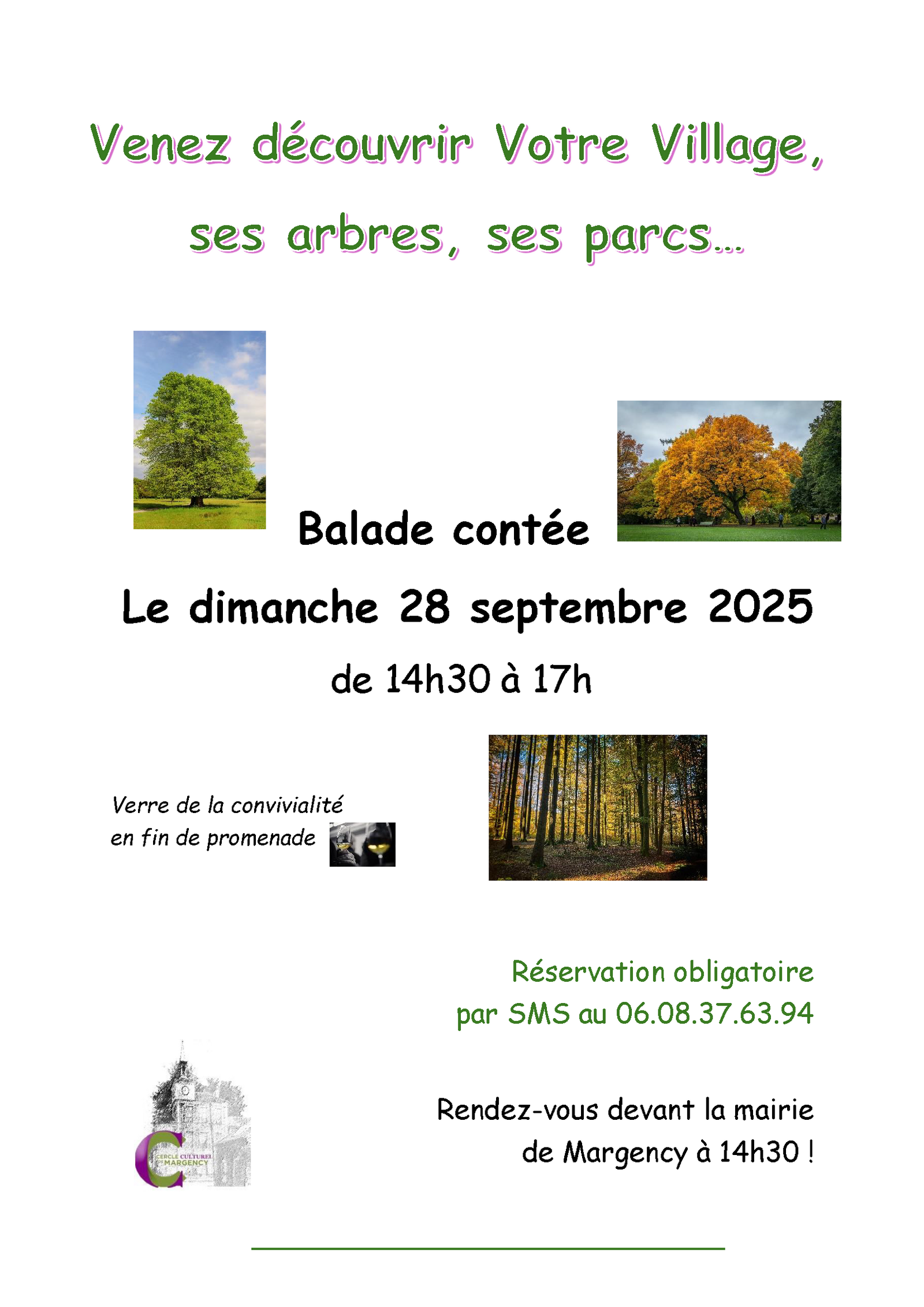 Balade contée Dimanche 28 septembre, de 14h30 à 17h, partez à la découverte du patrimoine exceptionnel de Margency lors d'une balade contée animée par Monsieur Collineau. Rendez-vous devant la mairie à 14h30. Au programme : un voyage captivant à travers les arbres remarquables de la ville, l’histoire des grandes propriétés et la richesse de leurs parcs. Une promenade mêlant nature et histoire, accessible à tous les curieux ! À travers anecdotes, récits et explications, Monsieur Collineau vous guidera dans un parcours unique mêlant nature, architecture et mémoire locale. Une sortie conviviale et enrichissante, idéale pour tous les amoureux du patrimoine et de la promenade. En fin de promenade, retrouvez-vous autour d'un verre de la convivialité. Réservation obligatoire par SMS au 06 08 37 63 94. |