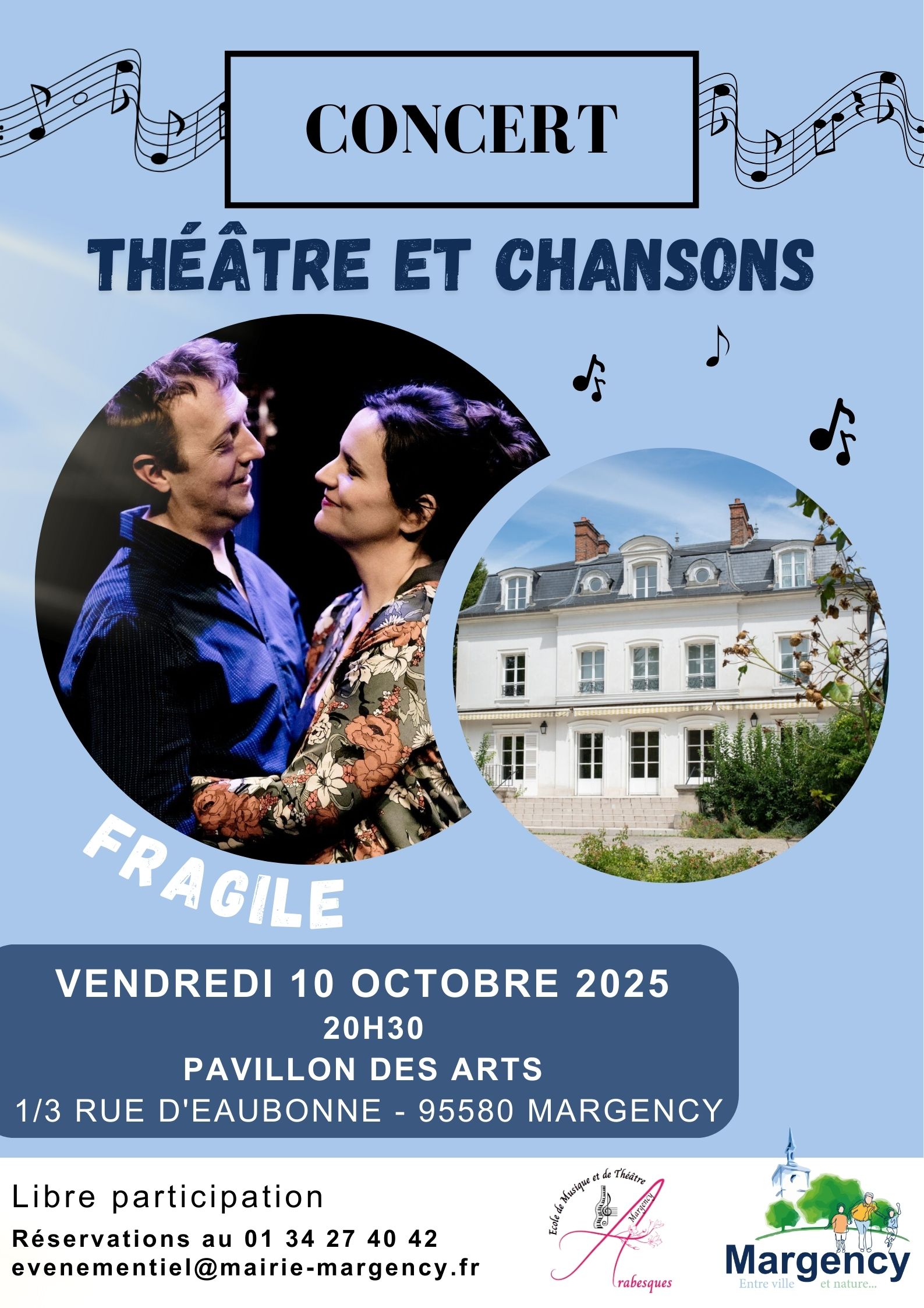 Concert théâtre Le premier concert d'Arabesques de la saison approche à grands pas ! Nous avons le plaisir de vous convier à une soirée musicale exceptionnelle qui se tiendra le vendredi 10 octobre à 20h30, dans le cadre enchanteur du Pavillon des Arts. FRAGILE, un couple d'artistes (Isabelle Loisy et Rémi Auclair) met en scène et interprète un couple de chanteurs, qui organise dans leur salon, l’ultime répétition de « Amours sans détour », leur nouveau concert dédié à l’amour. Mais cette mise en abyme leur tend un miroir dans lequel ils sont obligés de regarder leur propre histoire d’amour. Fragile tente de passer à travers les masques pour essayer de toucher au vrai, au subtil, à ce que nous voulons cacher plus que tout. Faire apparaître ce qui forme les peurs les plus profondes qui cimentent ou divisent les couples. On chemine de la comédie au drame, du cliché au sensible, portés par les chansons d'amour de Dominique A., Charles Aznavour, Juliette, Leprest et bien d'autres encore, autour d'une contrebasse et des arrangements inédits électro-pop/jazz. Libre participation. Renseignements et réservations au 01 34 27 40 42 ou par mail à evenementiel@mairie-margency.fr |