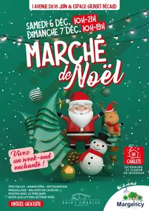 Marché de Noël 2025 Le Marché de Noël fait son grand retour à Margency ! Rendez-vous les samedi 6 et dimanche 7 décembre le long de l'avenue du 18 Juin pour plonger dans une ambiance féerique et festive. Au programme : une multitude de spectacles captivants, des animations pour petits et grands, ainsi qu’un vaste choix de produits artisanaux uniques pour vos cadeaux de fin d’année. Côté gourmandises, profitez d'une offre de restauration savoureuse qui saura ravir vos papilles. Venez partager un moment magique en famille ou entre amis et laissez-vous emporter par l’atmosphère enchantée du Marché de Noël de Margency. Un week-end inoubliable vous attend à Margency ! Plus d'informations au 01 34 27 40 74 ou par mail à evenementiel@mairie-margency.fr |