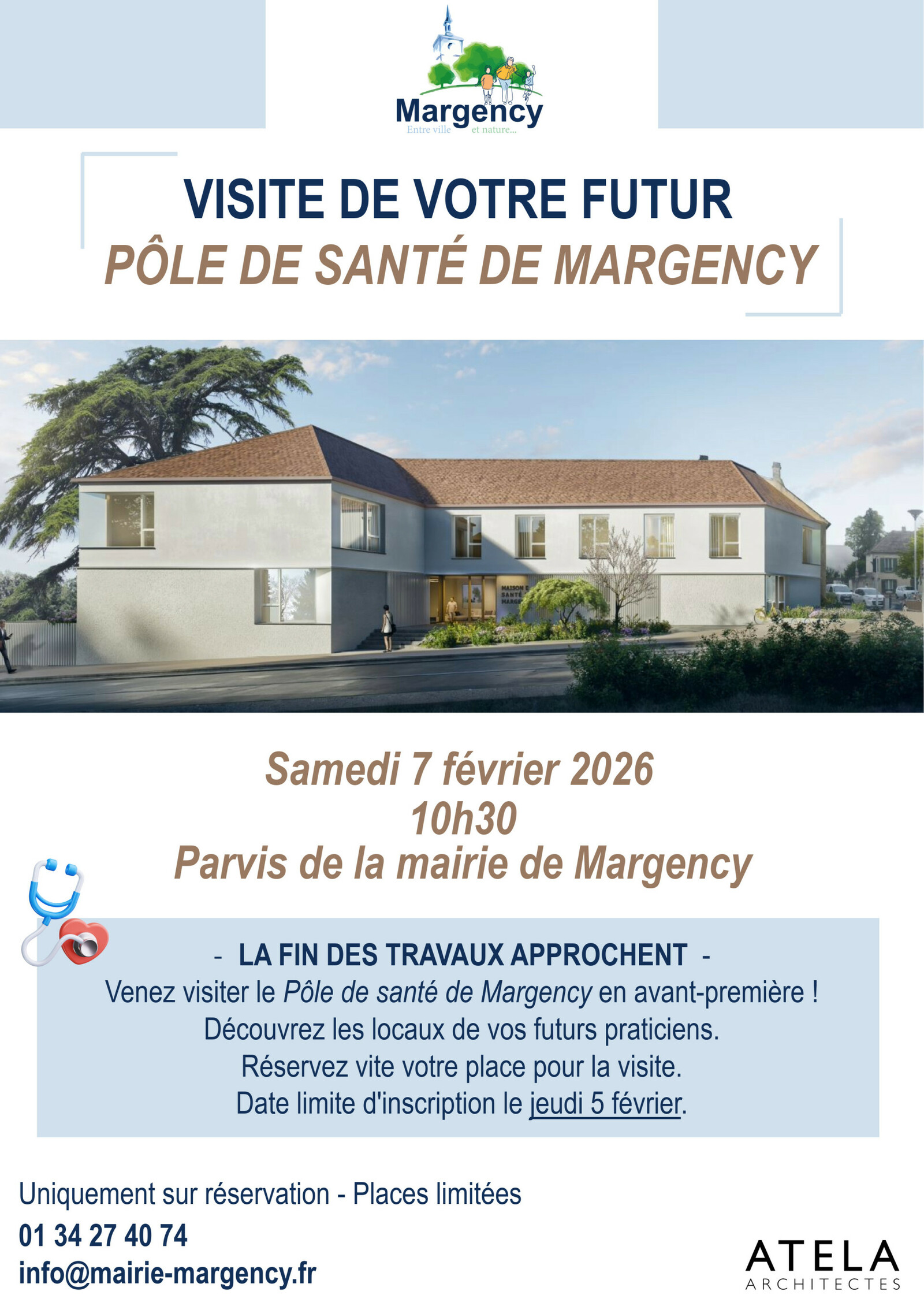 Visite guidée du Pôle de Santé La construction du Pôle de Santé de Margency est presque terminée. La ville vous propose de découvrir en avant-première les locaux qui accueilleront bientôt vos futurs praticiens. Date : samedi 7 février Cette visite guidée vous permettra de découvrir les espaces, de poser vos questions et de mieux connaître les services proposés. Attention : places limitées – inscription obligatoire avant le jeudi 5 février. |