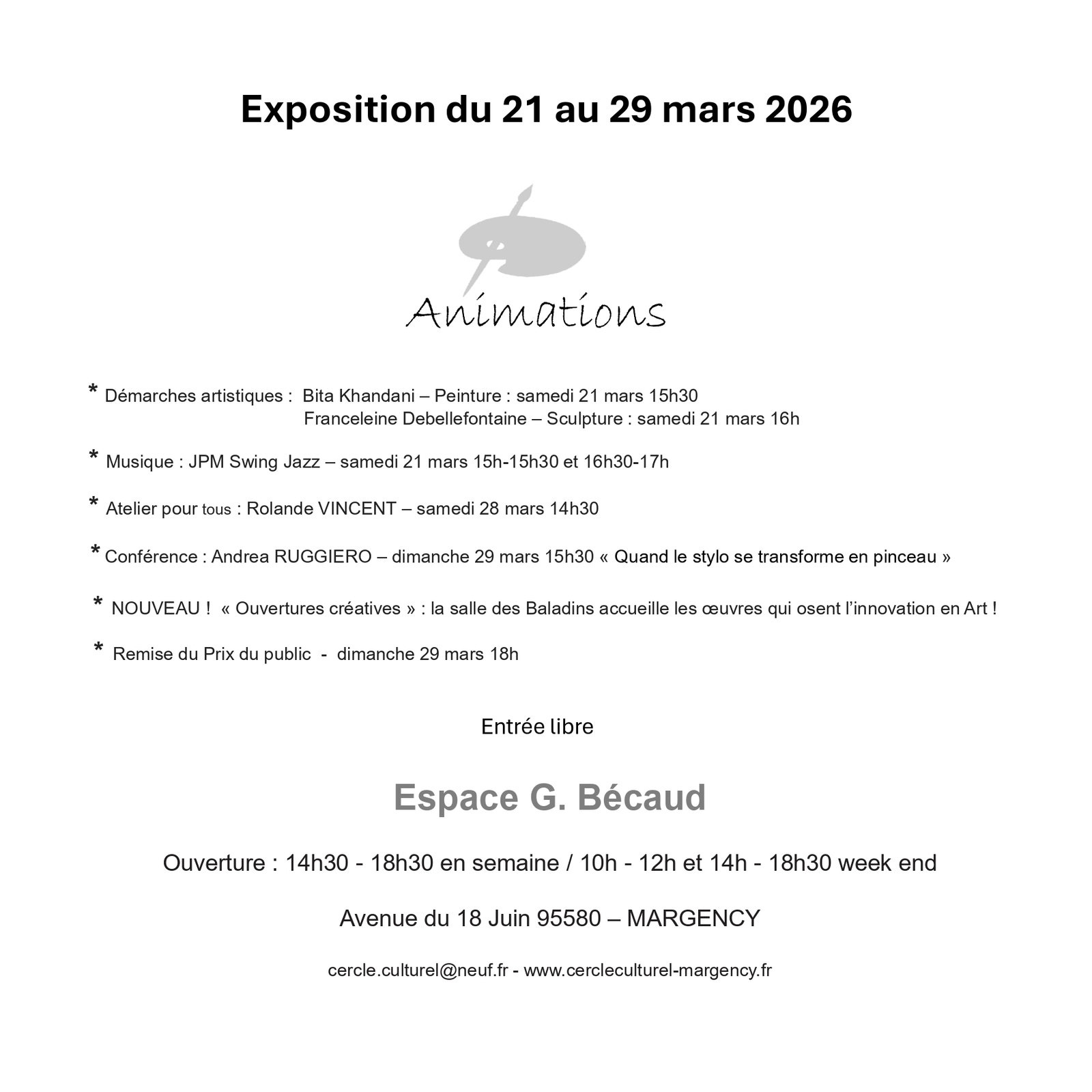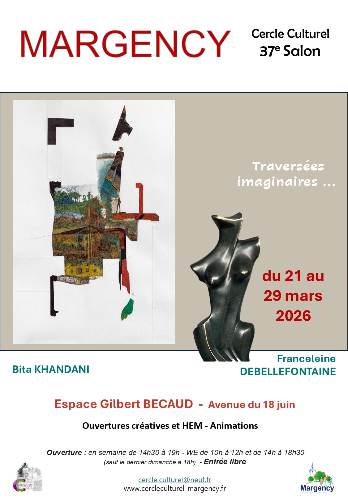 37e édition du Salon des Arts Le Salon des Arts est de retour en 2026 pour sa 37e édition autour du thème Traversées imaginaire ! Venez célébrer la créativité sous toutes ses formes. Peinture, gravure, sculpture… toutes les techniques et matériaux y sont mis à l'honneur. Artistes reconnus, jeunes talents et enfants de l’Hôpital de la Croix-Rouge vous exposent leurs œuvres dans une ambiance conviviale, le tout accompagné d'ateliers et d'animations qui rythmeront votre expérience. Une rencontre hors du temps à ne pas manquer. Votre événement aura lieu du samedi 21 mars au dimanche 29 mars à l'Espace Gilbert Bécaud ! Horaires de l'exposition : - De 14h30 à 19h en semaine. - De 10h00 à 12h00 et de 14h à 18h30 le week-end.