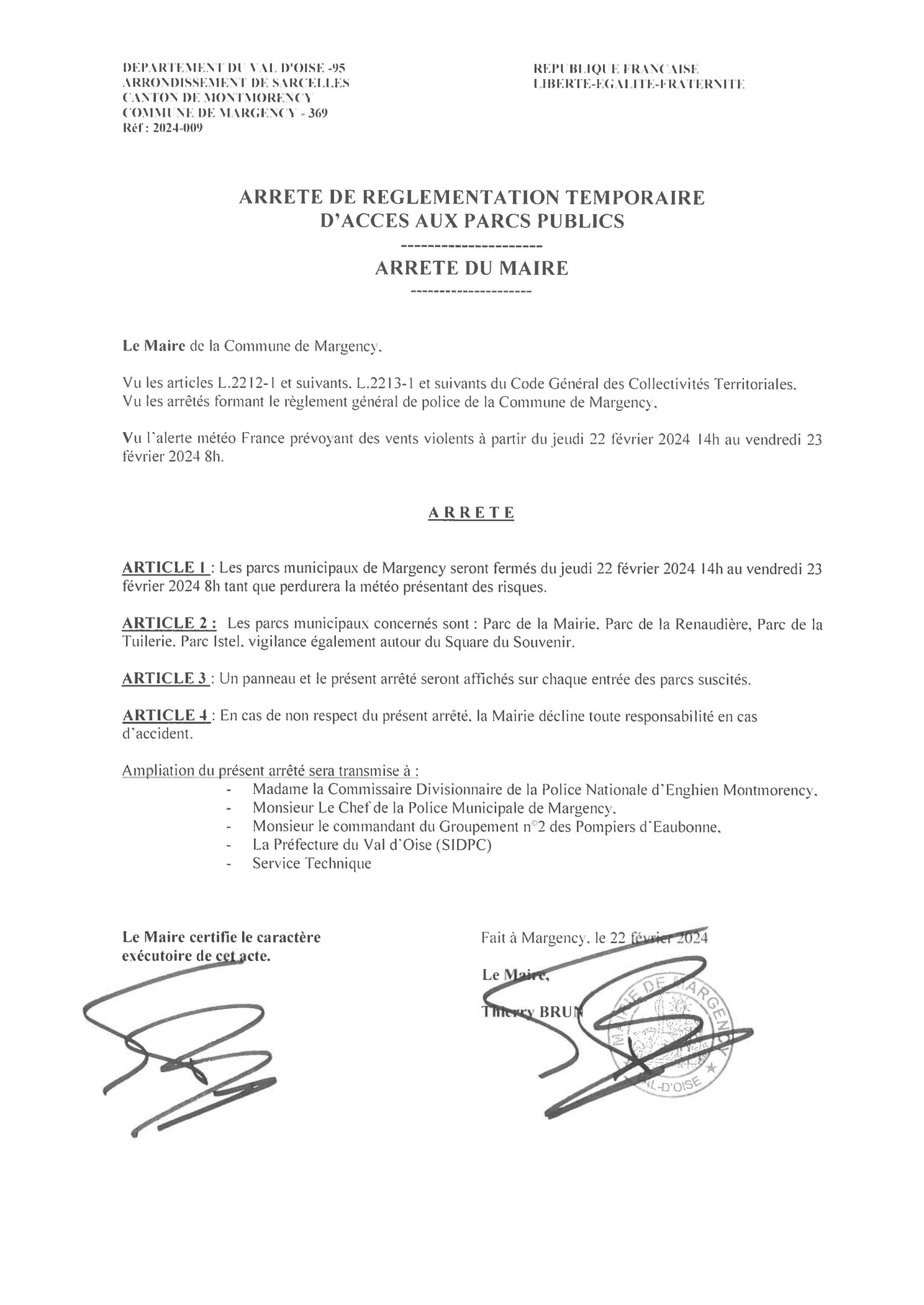 A cette occasion, les parcs municipaux de Margency seront fermés ce jour à partir de 14 h.