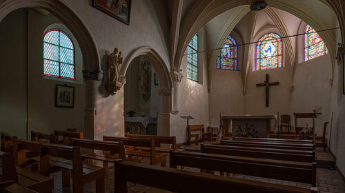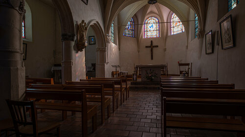 L'église de Margency Aujourd'hui Vue de la rue principale, l’église n’offre qu’un aspect humble et l’on oserait dire sans intérêt, avec un clocher court et massif. C’est depuis le parc de la propriété du château de la Croix Rouge qu’elle prend sa vraie grandeur. Son abside très pure, ses baies relativement harmonieuses et son toit en tuiles traditionnelles en font un édifice attachant. A l’intérieur, on perçoit les diverses retouches de l’édifice, de style pseudo-gothique : voûte en ogive et clés de voûte. Les clés de voute représentent : le Christ sur la croix, la Nativité Notre-Dame, et Dieu le Père tenant dans sa main une mappemonde. |